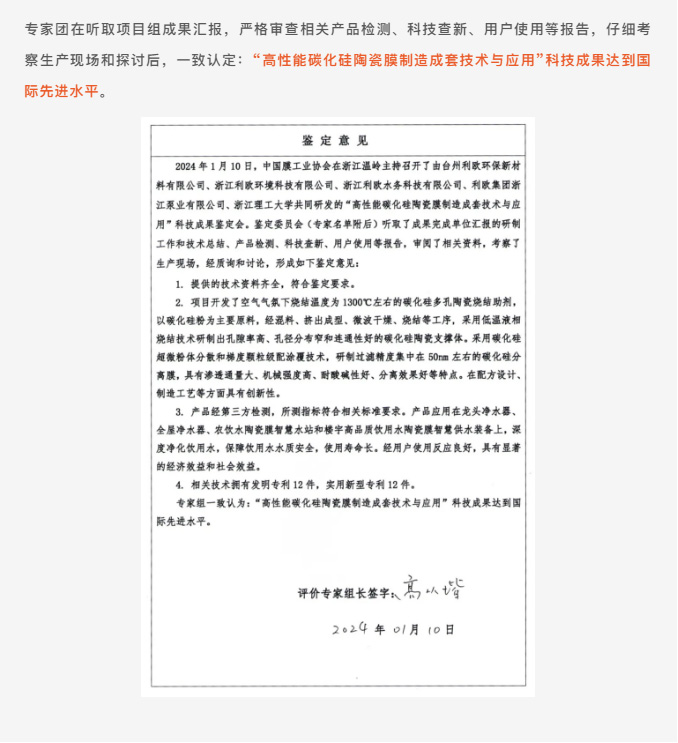 2024年1月,中國(guó)膜工業(yè)協(xié)會(huì)在浙江溫嶺主持召開了由利歐與浙江理工大學(xué)共同研發(fā)的“高性能碳化硅陶瓷膜制造成套技術(shù)與應(yīng)用”科技成果鑒定會(huì)。