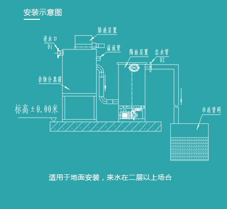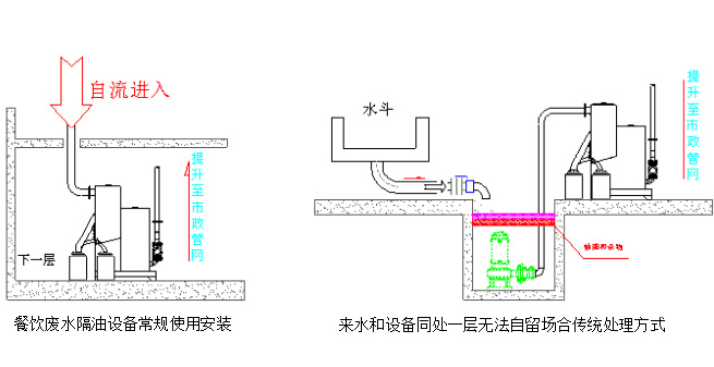 適用于各類地下餐飲廢水隔油處理與提升排放,如位于負(fù)一層的單位食堂、酒店餐飲區(qū)、地下商場(chǎng)、超市、美食城等餐飲廢水無(wú)法自動(dòng)排放需要?jiǎng)恿μ嵘欧诺膱?chǎng)所。