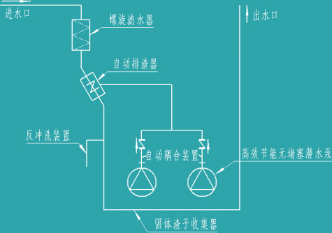 當污水流入時,通過螺旋濾水器,液體產(chǎn)生旋轉(zhuǎn),離心力的作用將污水與污物分離,污水通過濾水孔流入水箱,污物則進入自動排渣閥,由多功能排渣閥排入儲渣管內(nèi),當集水箱內(nèi)的污水達到設定的啟泵水位,液位檢測裝置反饋氣泵信號至控制系統(tǒng),通過控制柜啟動潛水泵,潛水泵排出的帶壓力污水通過多功能排渣閥,推起不銹鋼閥板擋住螺旋濾水器出口,使后續(xù)的污物停留在自動排渣器內(nèi)。而帶壓力的污水進入儲渣管。由于儲渣管管徑無變化,沒有泄漏點,管內(nèi)壁非常光滑,在壓力水的沖刷下,污物不易粘連、滯留堆積,從而將管內(nèi)的污物一并帶出排水口,排出箱外。待集水箱內(nèi)水位高度降低至停泵水位時,潛水泵停止工作,自動排渣閥恢復常態(tài),濾水管內(nèi)的污物再次進入儲渣管。為了防止停泵時產(chǎn)生的水錘壓力過大,導致排渣器無法打開,設備設有反沖洗裝置,通過反沖洗裝置可進行泄壓沖洗水箱底部,防止污垢長期積累。當采用雙泵控制時,兩泵一用一備,且自動交替運轉(zhuǎn)。
